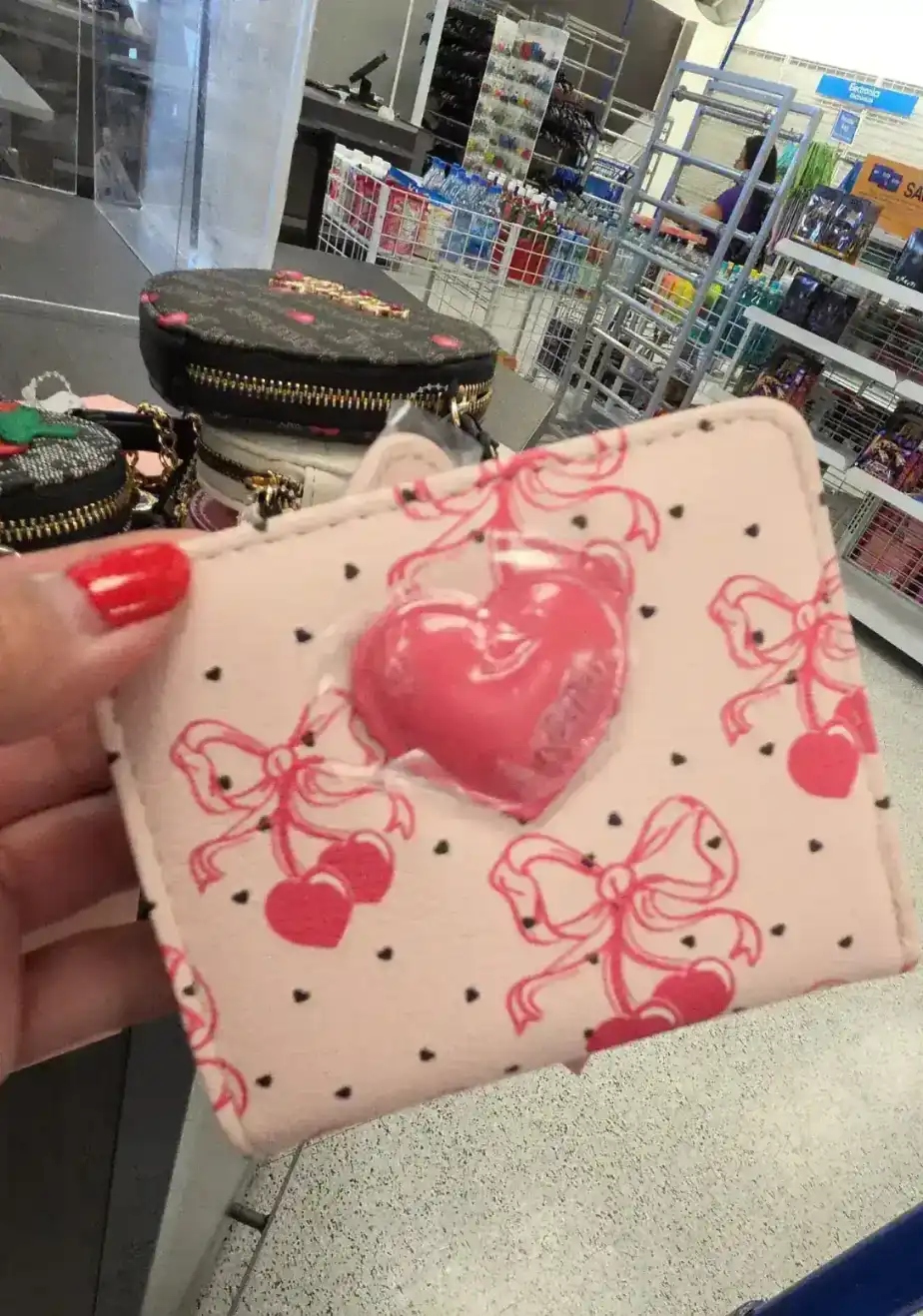 A cute pink wallet featuring a heart design and bow patterns, perfect for storing cards and cash.