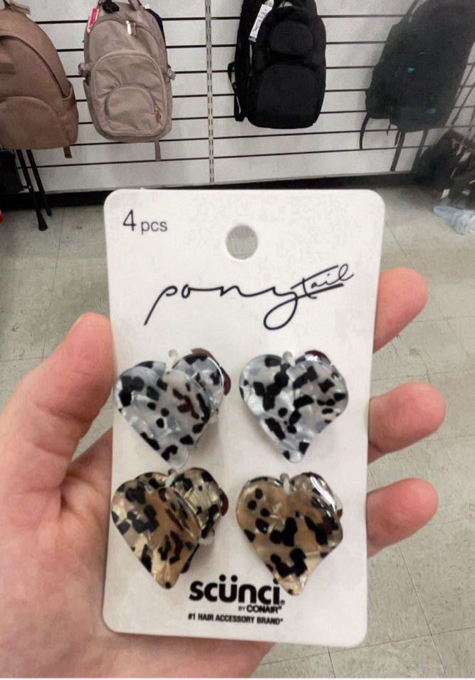 Set of four heart-shaped hair clips in various colors and patterns.