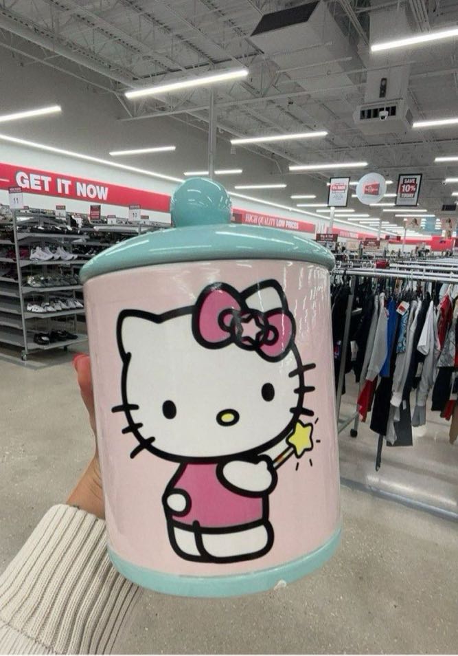 A decorative cookie jar featuring Hello Kitty with a pink background and a blue lid.