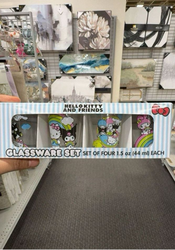 A set of four Hello Kitty themed glassware, each with a capacity of 1.5 oz (44 ml).