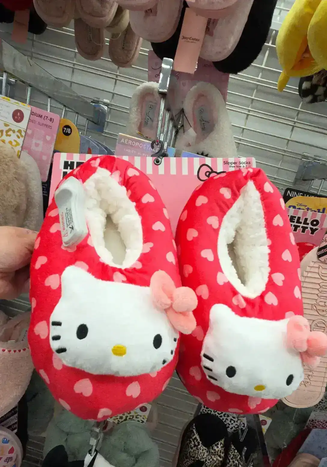 Cute red slippers featuring Hello Kitty with heart patterns and a bow. Size 6 to 7.5