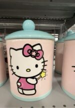 A decorative storage jar featuring Hello Kitty with a pink and blue design.