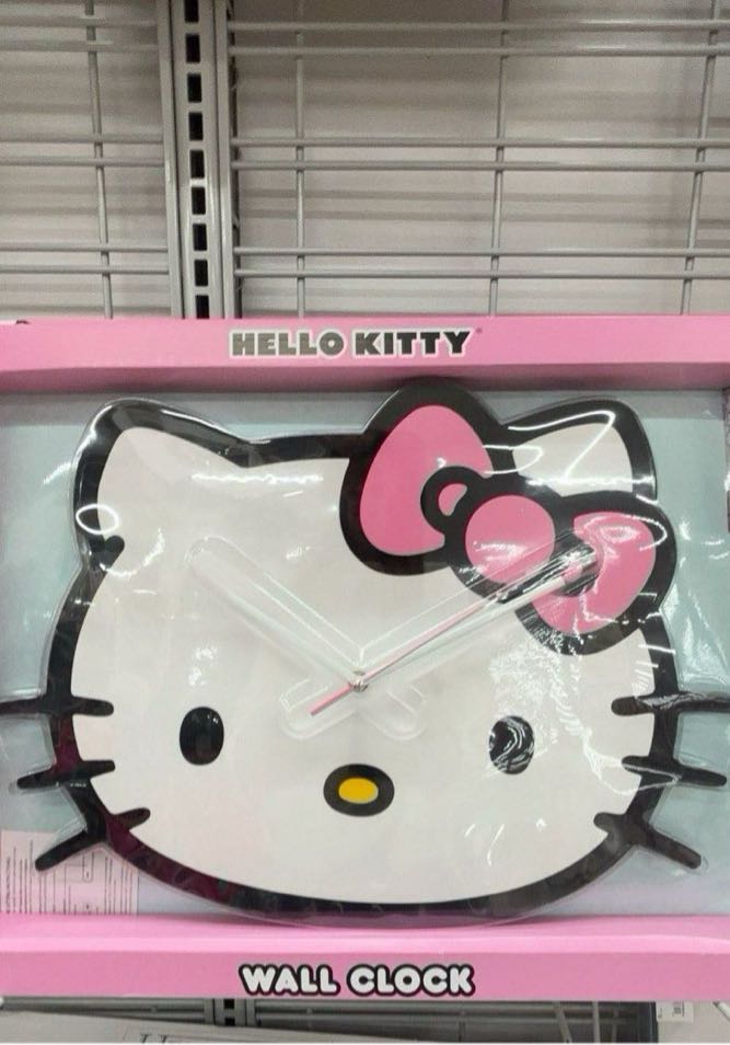 A cute wall clock designed in the shape of Hello Kitty’s face, featuring a pink bow and simple clock hands.