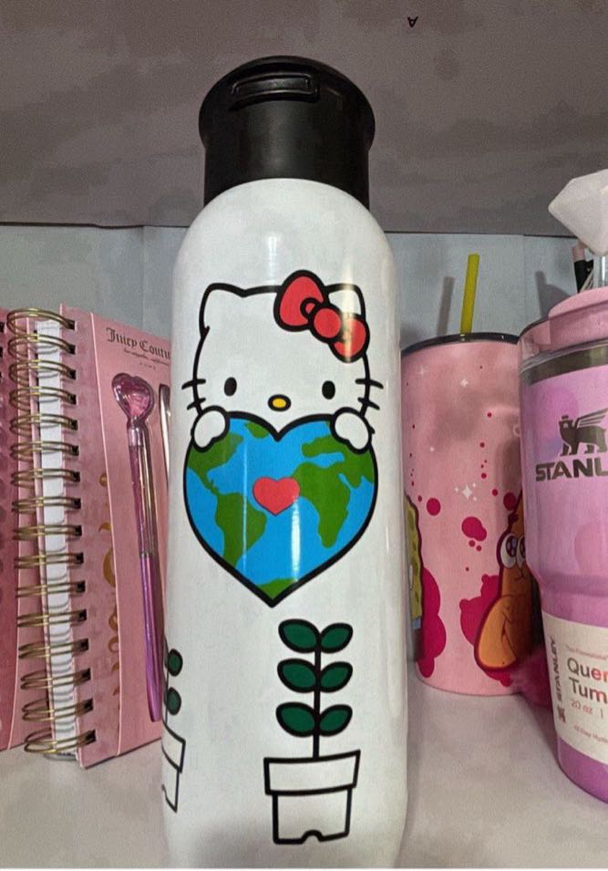 A white water bottle featuring a Hello Kitty design holding a globe with a heart, surrounded by potted plants.