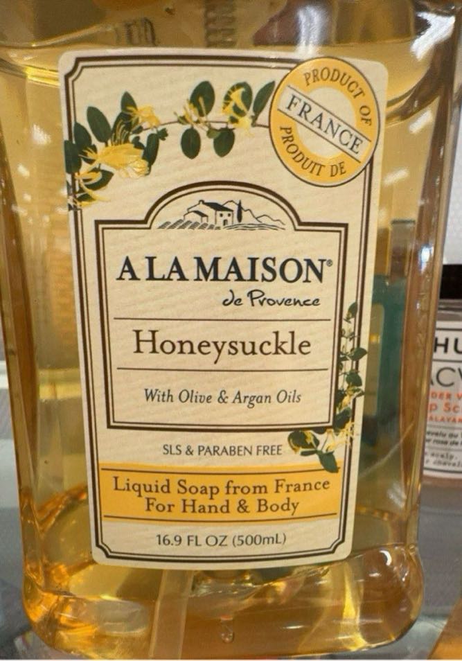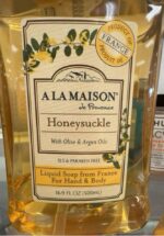 A La Maison de Provence Honeysuckle liquid soap enriched with olive and argan oils, suitable for hand and body use.