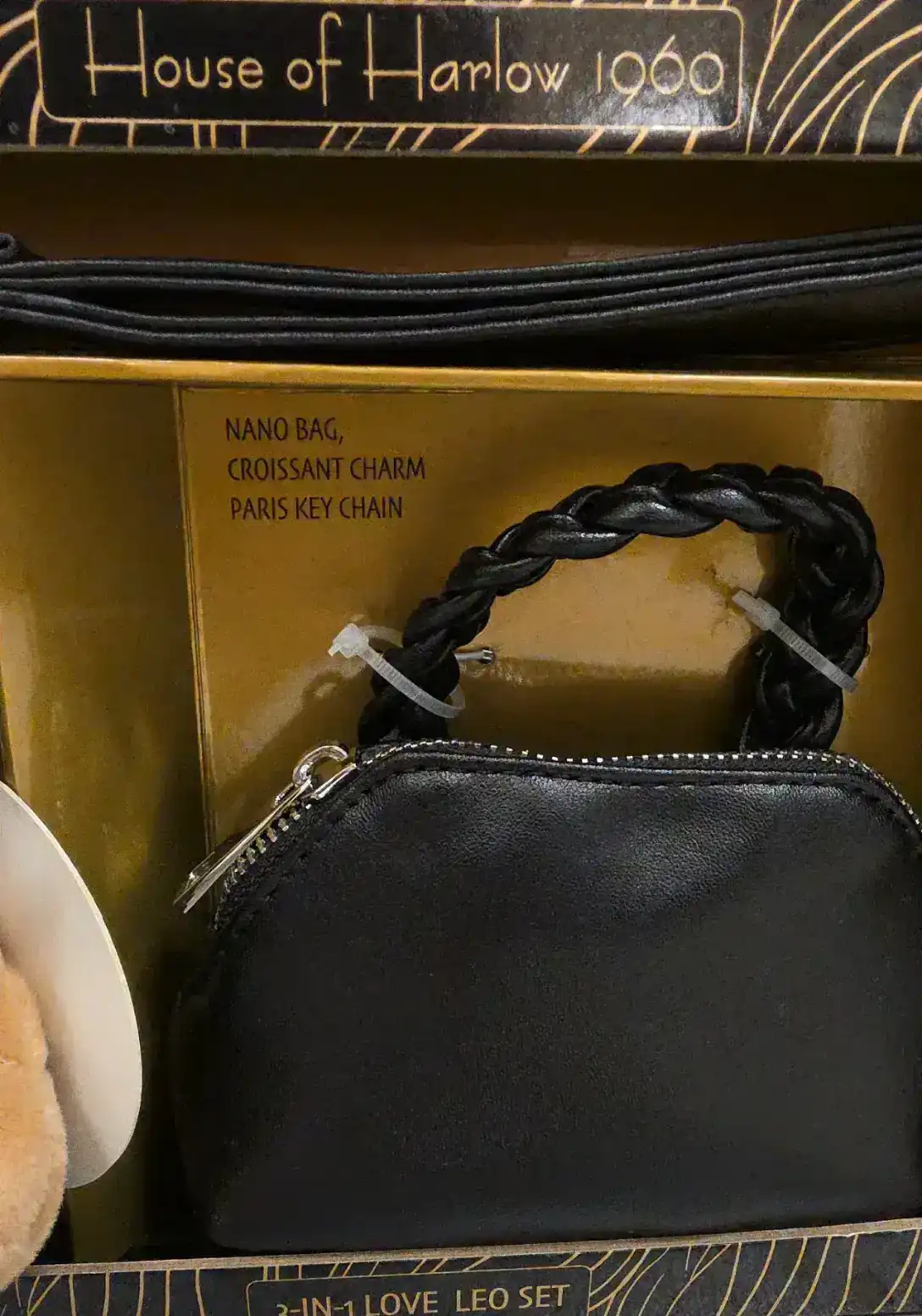 A stylish nano bag set featuring a croissant charm and a Paris key chain, perfect for adding a chic touch to any outfit.