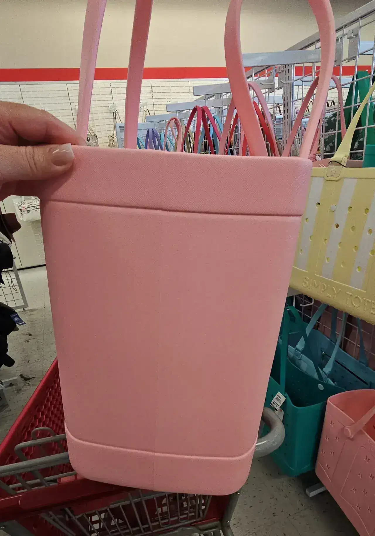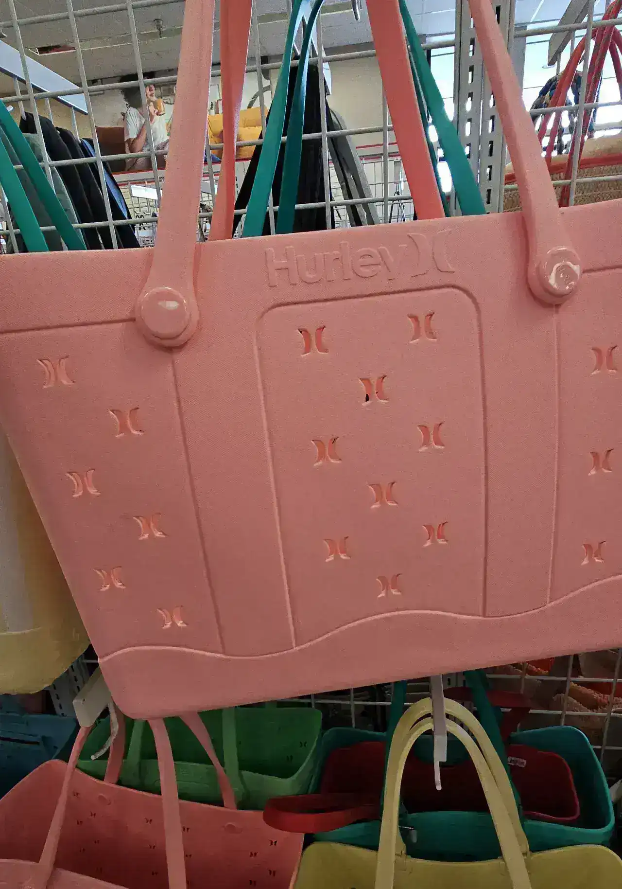 A stylish pink tote bag with a perforated design, perfect for beach outings or casual use. Made from durable material, it features sturdy handles for easy carrying.