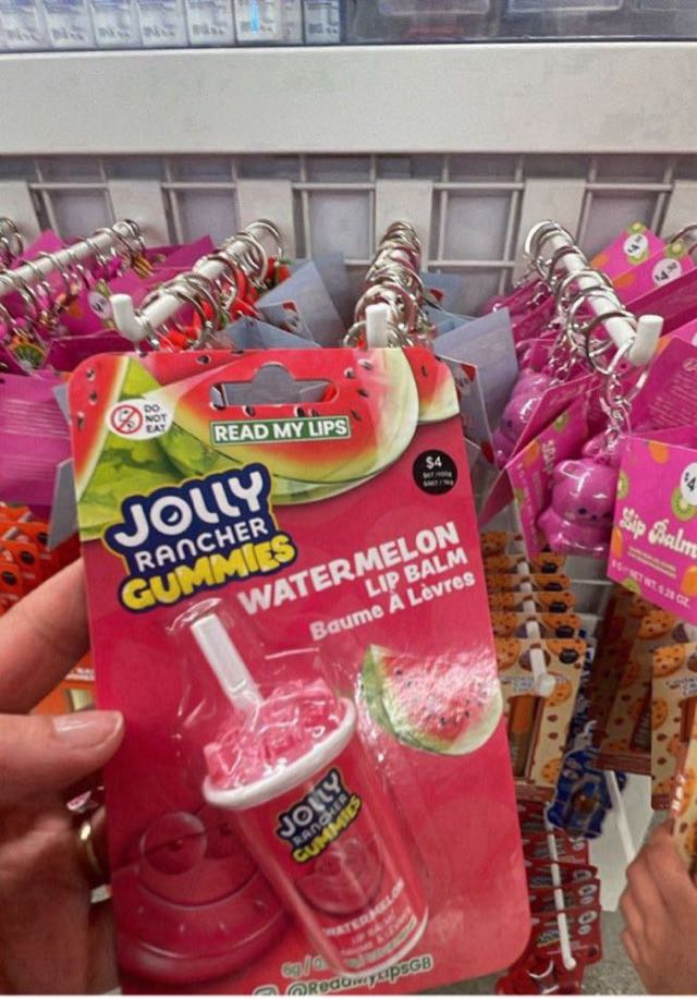 This lip balm features a fun watermelon flavor inspired by Jolly Rancher candies. It comes in a playful packaging resembling a drink cup.