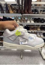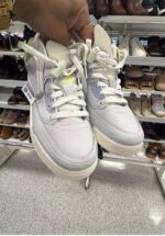 A pair of stylish men’s sneakers featuring a light gray color with neon accents. Designed for comfort and performance.
