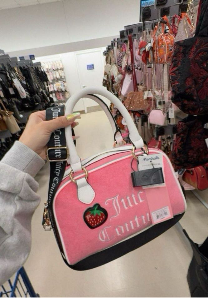 A stylish pink handbag featuring a strawberry design and the brand name ‘Juice Couture’ prominently displayed.