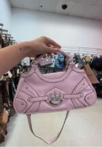 A stylish pink handbag featuring a crown emblem and decorative stitching.