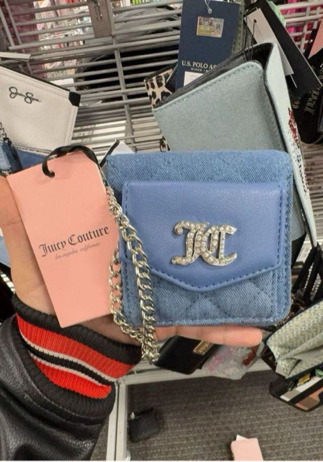 A stylish card holder featuring a denim design with a blue flap and rhinestone logo.