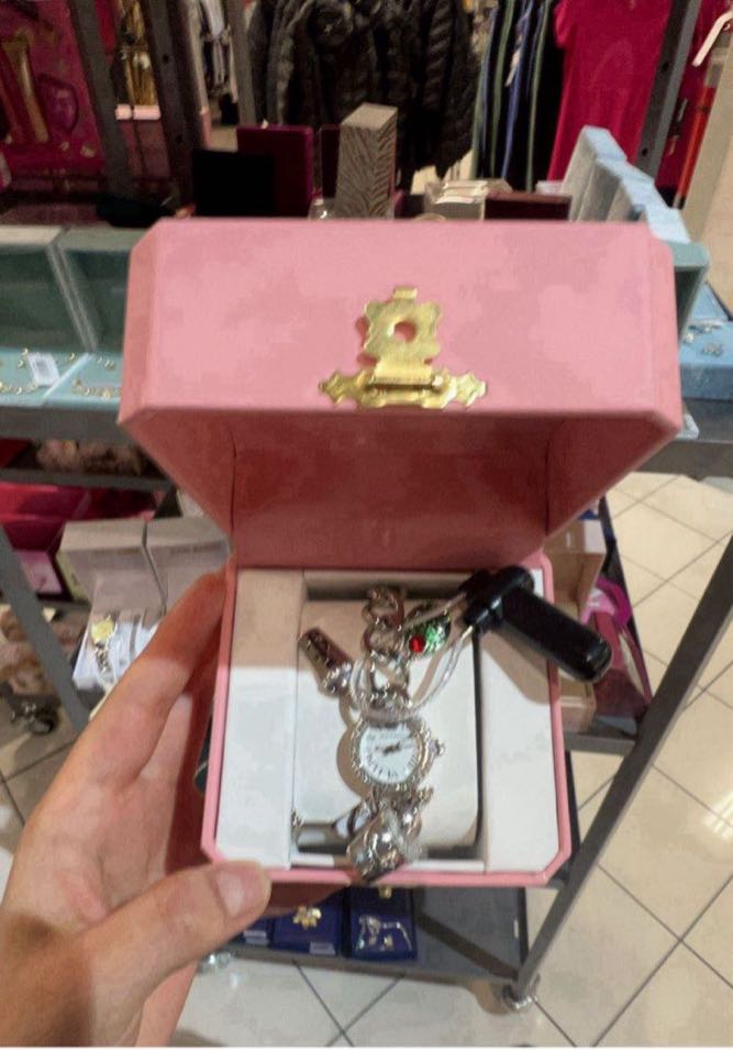 A decorative charm bracelet featuring a small watch, presented in a pink box.
