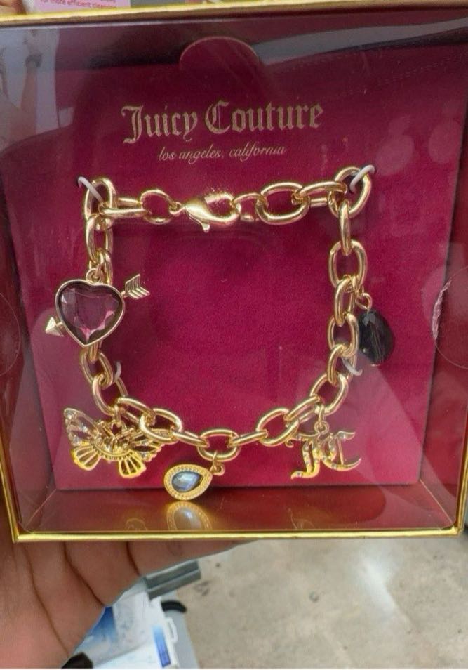 A stylish gold-tone charm bracelet featuring various decorative charms, presented in a branded box.