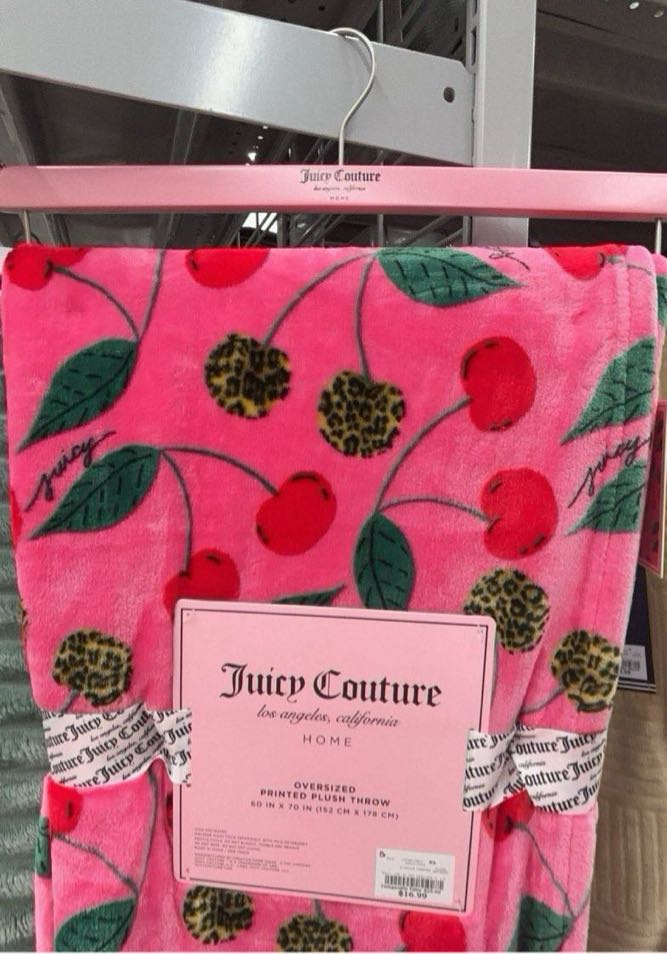 A vibrant pink oversized plush throw featuring a cherry and leopard print design.