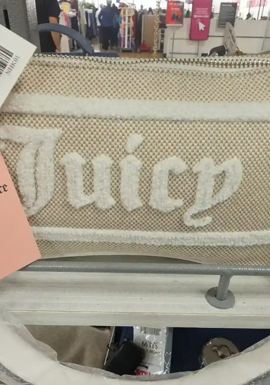 A stylish beige clutch featuring the iconic ‘Juicy’ logo in a textured design.