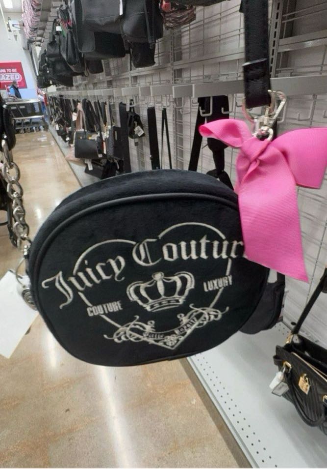 A stylish black crossbody bag featuring the Juicy Couture logo and a pink bow accent.