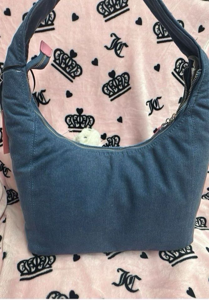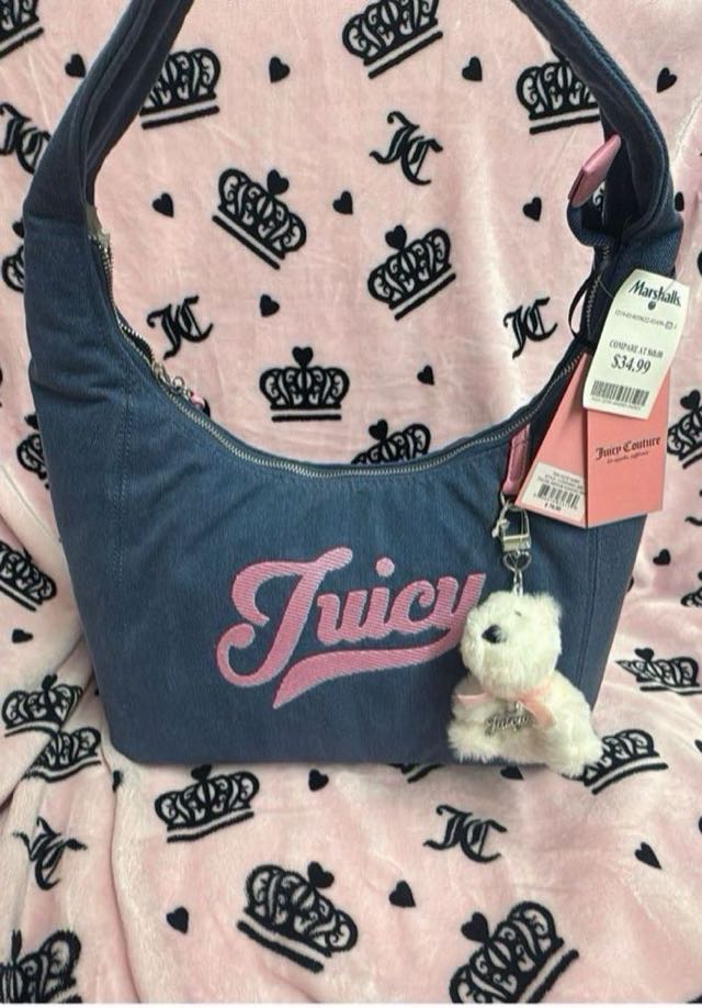 A stylish denim hobo bag featuring the iconic ‘Juicy’ logo and a cute bear charm. Perfect for casual outings. Juicy Couture Medium Washed Denim Too Cu…o