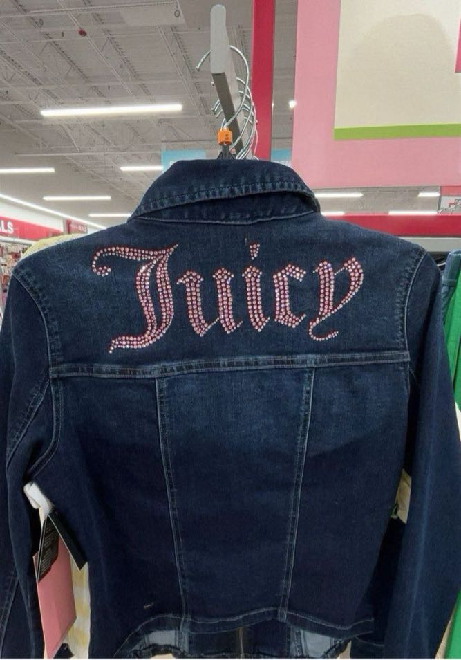 A stylish dark denim jacket featuring rhinestone detailing with the word ‘Juicy’ on the back.