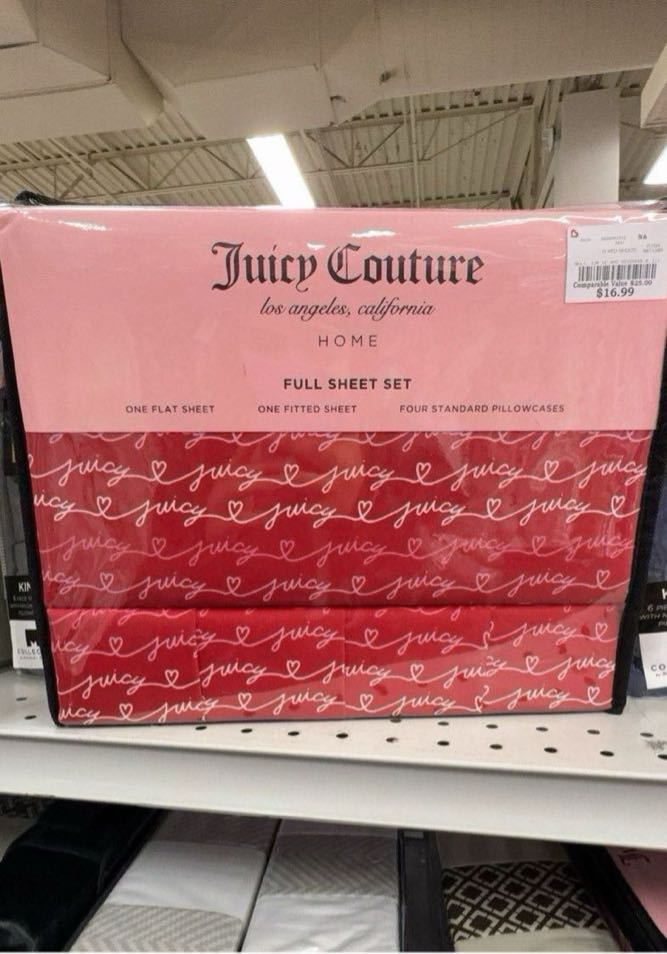 A stylish full sheet set featuring a flat sheet, fitted sheet, and four standard pillowcases, designed with a chic Juicy Couture pattern.