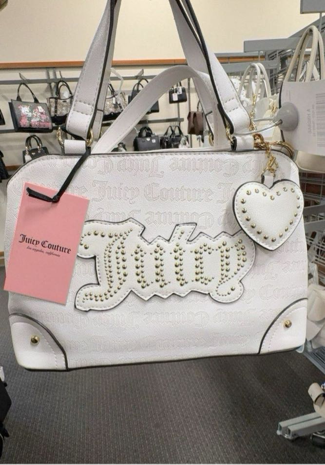 A stylish white handbag featuring a prominent ‘Juicy’ logo with studded detailing and a heart-shaped charm.