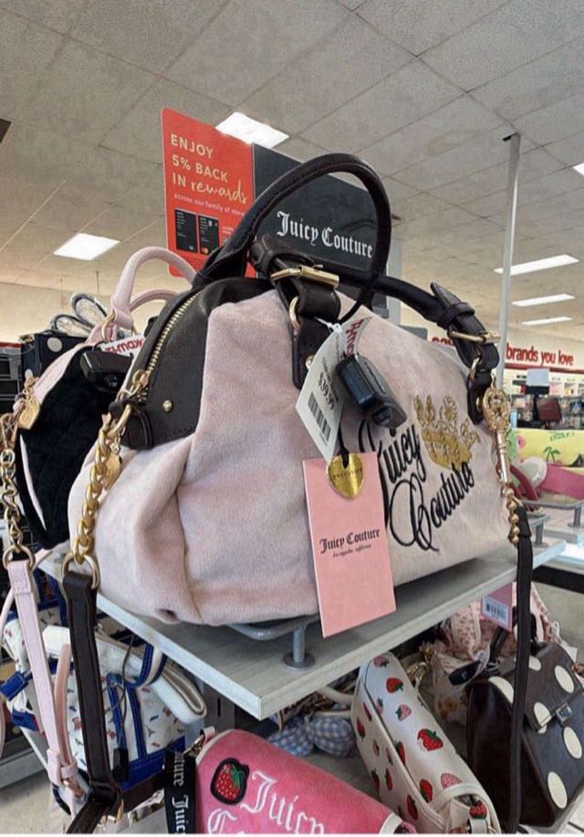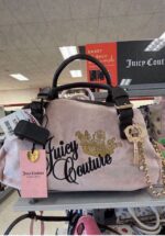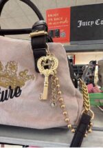 A stylish Juicy Couture handbag featuring a soft pink exterior with gold accents and a decorative keychain. The bag has a structured design with sturdy handles.
