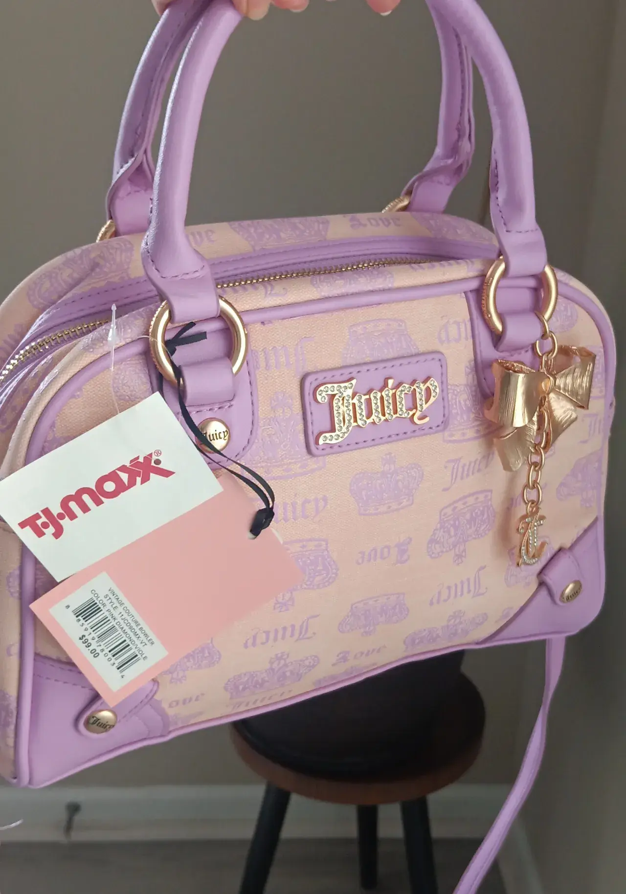 A stylish handbag featuring a pink and lavender design with gold accents. It includes a charm and is perfect for everyday use.