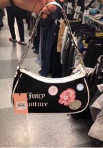 A stylish black handbag featuring a chain strap and decorative patches. Perfect for adding a trendy touch to any outfit.