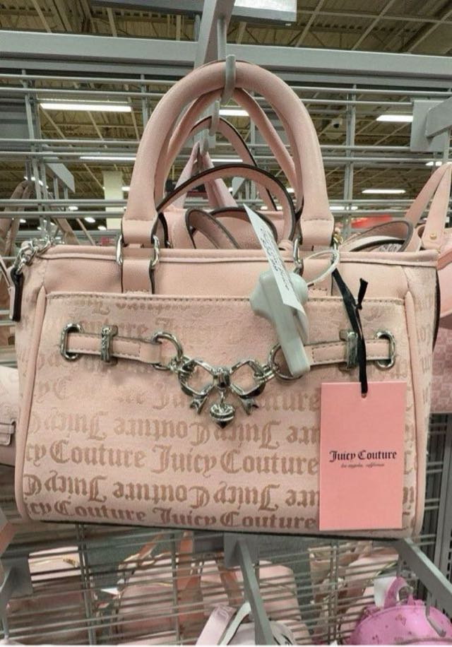 A stylish pink handbag featuring the Juicy Couture logo in a repeating pattern, adorned with a chain detail.