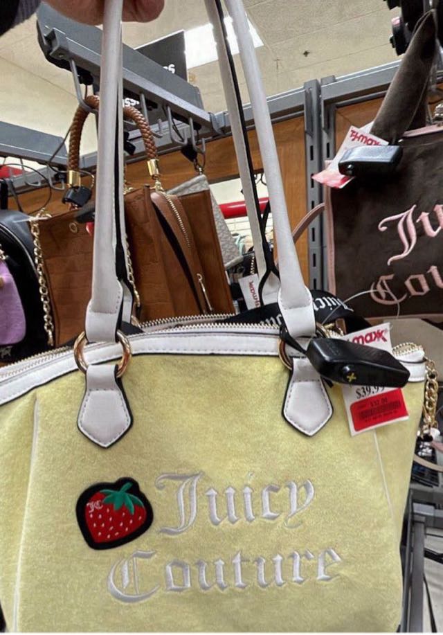 A stylish yellow handbag featuring a strawberry patch and the Juicy Couture logo. It has structured sides and a zip closure.