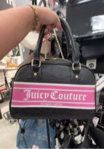 A stylish black handbag featuring a pink Juicy Couture logo across the front.