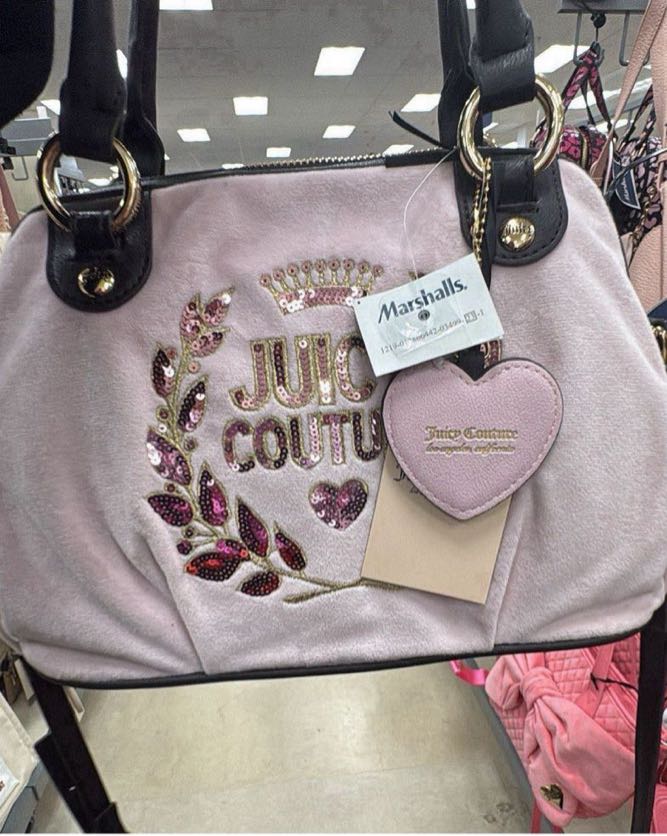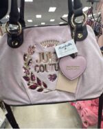 A stylish pink handbag featuring decorative embellishments and a heart-shaped tag.