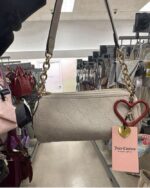A stylish beige handbag featuring a quilted design and a heart-shaped charm.