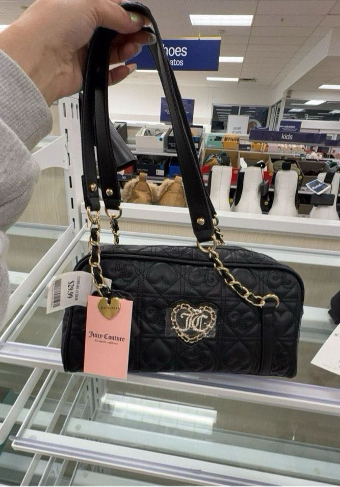 A stylish black quilted handbag featuring a heart-shaped logo and gold chain accents.