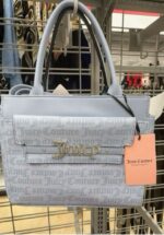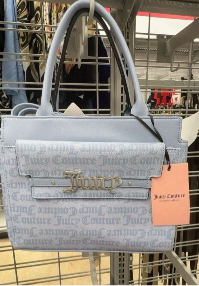 A stylish light blue handbag featuring the Juicy Couture logo in a repeating pattern.