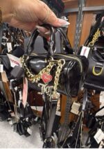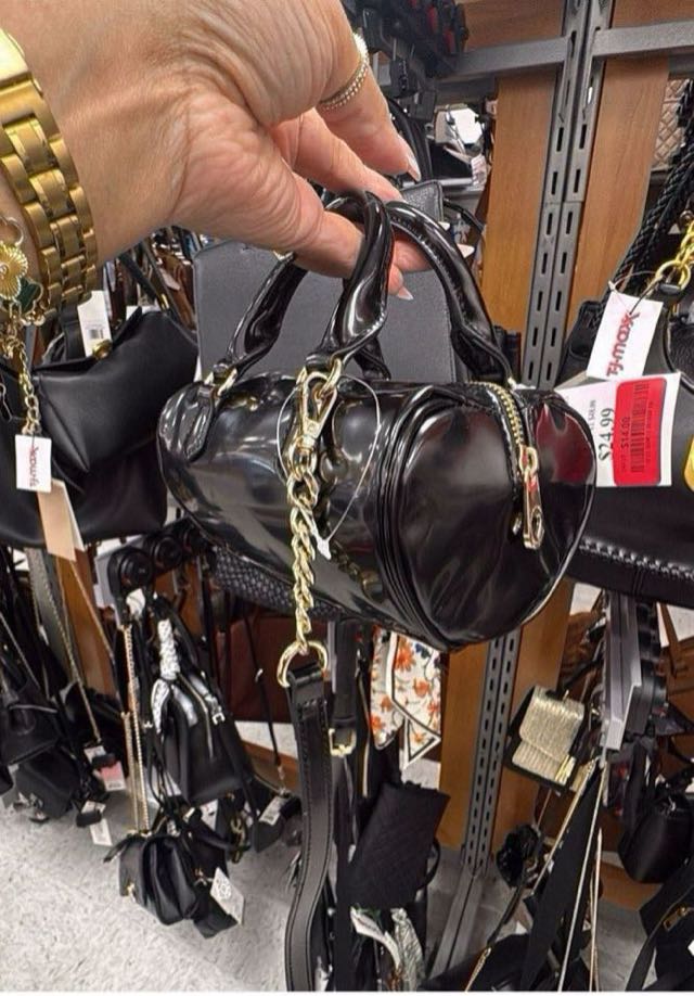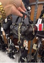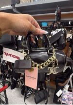 A stylish mini handbag from Juicy Couture featuring a shiny black finish and gold-tone chain accents. Perfect for adding a chic touch to any outfit.