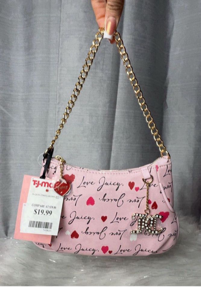 A stylish mini purse featuring a pink design with heart prints and the phrase ‘Love Juicy’. It includes a chain strap and decorative charms.