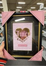A stylish black and gold picture frame with a pink background featuring the Juicy Couture logo.
