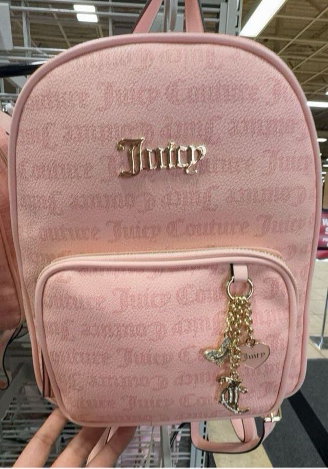 A stylish pink backpack featuring the Juicy Couture logo and a decorative charm.