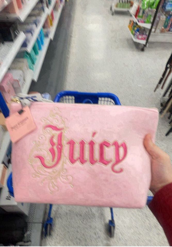 A stylish pink cosmetic bag featuring the word ‘Juicy’ in decorative lettering.