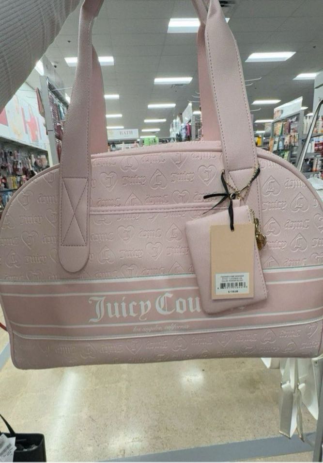 A stylish pink handbag featuring embossed branding and a matching tag.