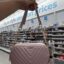 A stylish pink handbag featuring a logo design and gold accents. Perfect for everyday use or special occasions.
