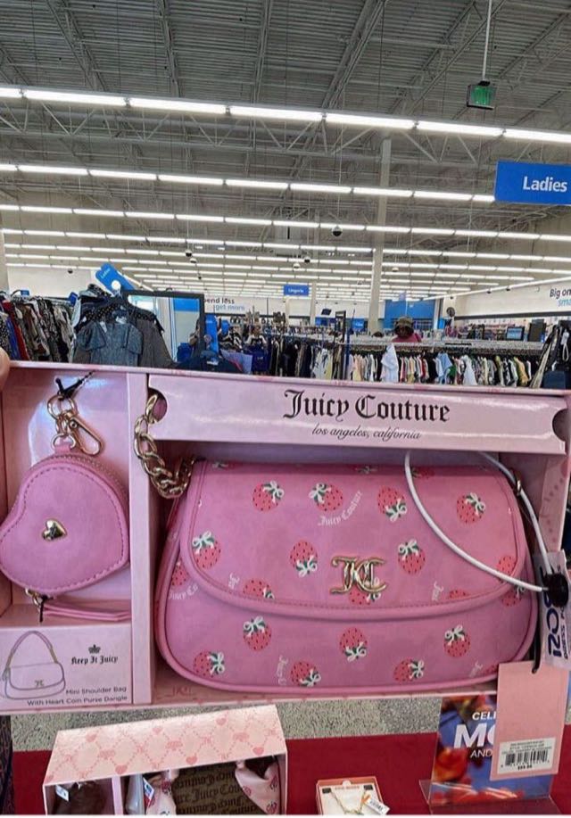 This stylish pink handbag set from Juicy Couture includes a main handbag and a matching mini accessory pouch, both adorned with floral designs. Perfect for adding a pop of color to any outfit.