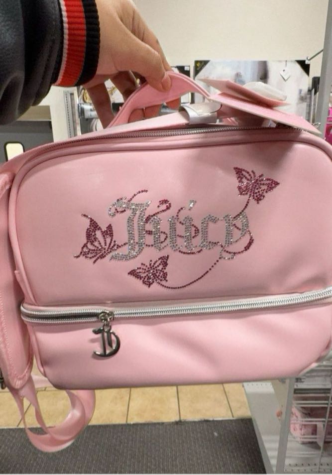 A stylish pink cosmetic bag featuring a sparkling ‘Juicy’ logo with butterfly designs.