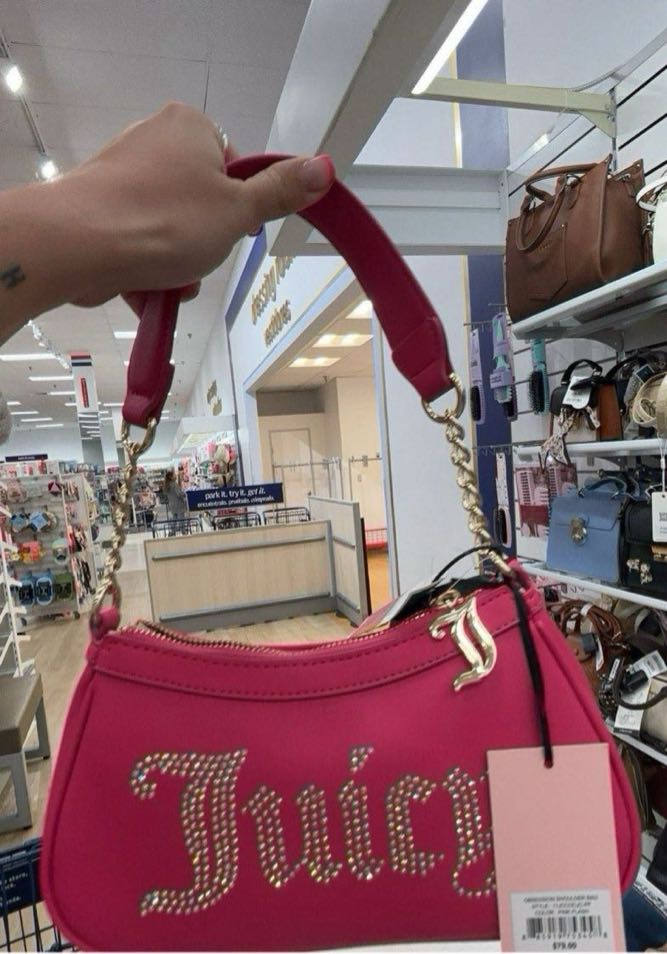 A stylish pink handbag featuring rhinestone detailing with the brand name ‘Juicy’ prominently displayed.