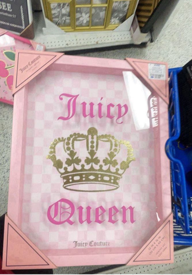 A decorative frame featuring a pink and gold design with the text ‘Juicy Queen’ and a crown motif.