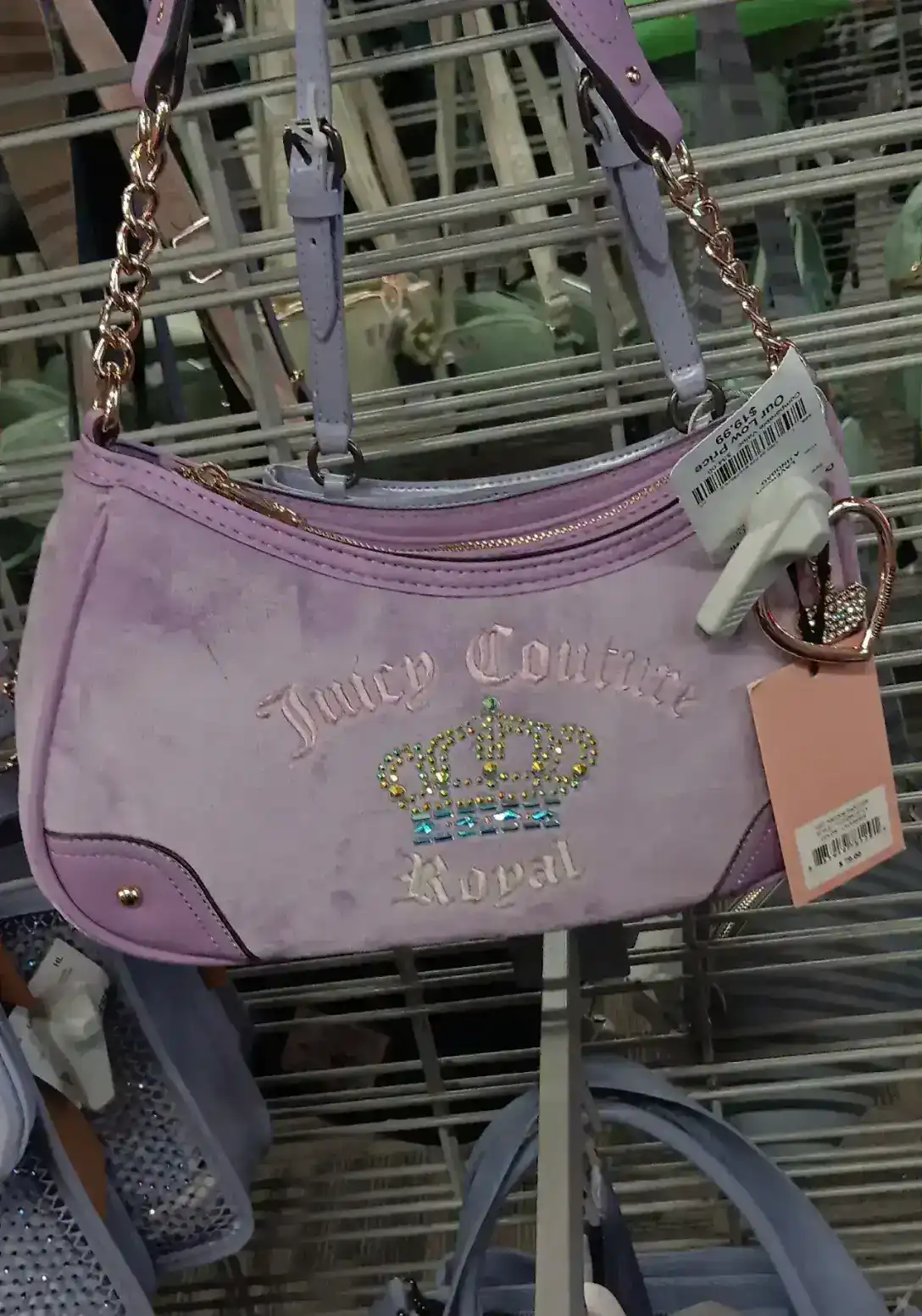 A stylish purple handbag featuring a decorative crown and the Juicy Couture logo. Perfect for adding a pop of color to any outfit.