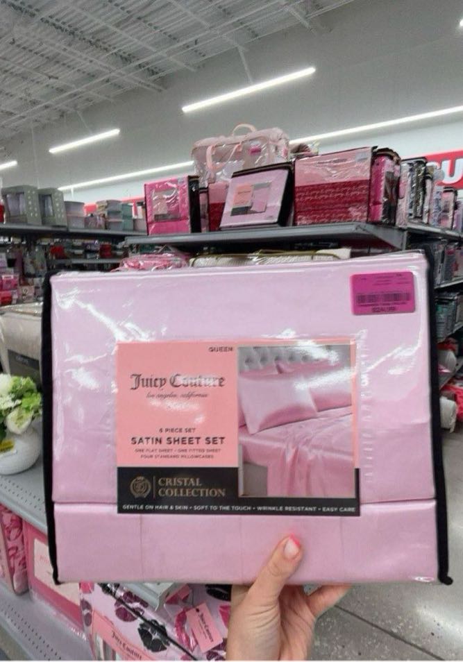 A queen-sized satin sheet set in a soft pink color, featuring a luxurious feel and easy care.