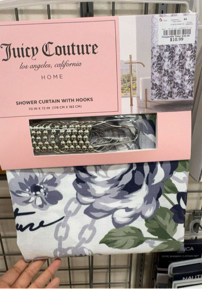 A floral-patterned shower curtain with hooks included, designed by Juicy Couture.
