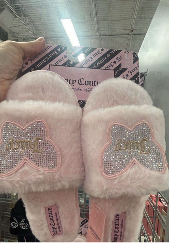 These plush pink slippers feature a decorative bow with rhinestones and the Juicy Couture logo. They are designed for comfort and style.